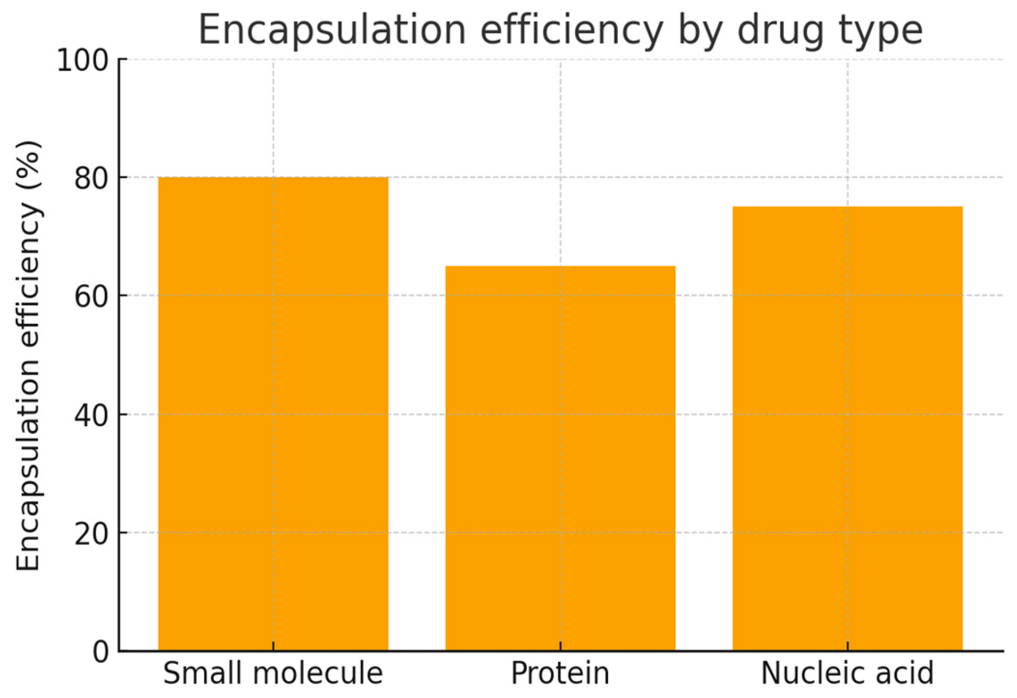 Biodistribution studies showed preferential accumulation of nanoparticles in tumor tissues, with a 4-fold increase in tumor-to-normal tissue ratio compared to free drug formulations. In therapeutic efficacy studies, nanoparticle formulations resulted in significant tumor growth inhibition (75% reduction in tumor volume) and improved survival rates (median survival increased by 45 days) compared to conventional drug administration. Small molecules show the highest encapsulation efficiency (~80%), nucleic acids slightly less (~75%), and proteins the lowest (~65%). This highlights how the type of drug strongly influences encapsulation performance in nanoparticle drug delivery systems (
