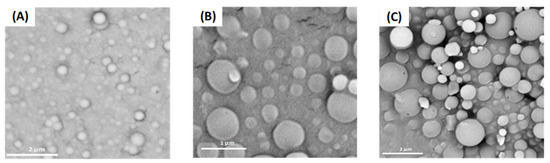 SEM images of polyDBB nanoparticles obtained by the ESE method with the use of: (A) SDS, (B) CTAB, and (C) PVAl as surfactant.
