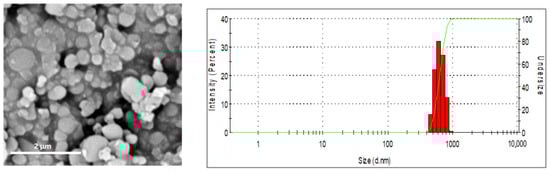 Particles obtained by the solvent evaporation method were in the range of 250–2400 nm for different formulation conditions. The nanoparticles were spherical in shape and had a smooth surface. The morphology of the polyDBB particles is shown in Figure 2.