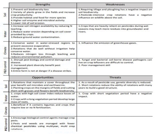 SWOT Analysis of environmental impacts of polyculture and crop rotation [,,].