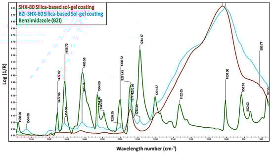 The organic BZI was successfully incorporated into the SHX sol–gel base formula by comparing the infrared spectrum obtained from the BZI-SHX-80 coating to that of the unmodified SHX-80. This is enlarged in Figure 2. In the spectrum of the BZI-modified coating, several peaks are seen related to the BZI molecule. These peaks can be observed and were retained in the sol–gel-coated BZI-SBX-80 sample. They are as follows: weak imine C=N stretching at 1564.5 cm−1; carbon double-bond C=C stretching peaks at about 1477 cm−1, 1458 cm−1, and 1408 cm−1, respectively. Similarly, the fingerprint of the aromatic amine stretching C–N can be detected at 1364 cm−1 and 1300 cm−1, respectively, which can be used to confirm the benzimidazole’s presence in the new sol–gel formula. The C–H out-of-plane bending is characterized by the peaks at 768 cm−1 and 745 cm−1 [].