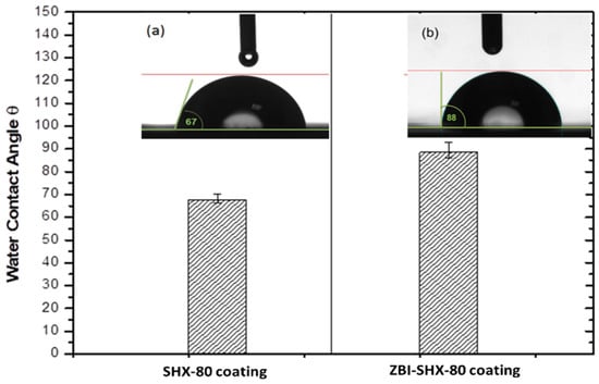 As shown in Figure 3, the measured water contact angle (WCA) of the base SHX-80 coating was about 67 ± 2°, as shown in Figure 3a, and the measured WCA on the modified BZI-SHX-80 sol-gel coating was 88 ± 4°, as shown in Figure 3b; the higher water contact angle recorded for the BZI-SHX-80 shows that its wettability is lower than that of the original SHX-80 [].