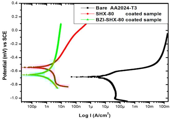 All coated samples displayed significantly improved performance compared to the bare AA2024-T3 sample. The corrosion potential (Ecorr) and corrosion current density (Icorr) were obtained from PDPS, as shown in Figure 4. The current density on the cathodic branch of the Tafel curve for all coated samples was reduced by more than four magnitudes when compared to the bare AA2024-T3. Nevertheless, the current density of the BZI-SHX-80-coated sol–gel sample was the lowest, as it was reduced by seven orders of magnitude compared to the bare AA2024-T3. This reduction may be attributed to benzimidazole’s surface activity and high electronegativity []. The SHX-80 sol–gel only showed a reduction in the anodic branch by about four and a half orders of magnitude less than the bare AA2024-T3. The corrosion current densities of the bare and coated samples were reduced to for BZI-SHX-80 and for SHX-80, respectively, compared to for the bare AA2024-T3 alloy. The shift in Ecorr indicates that the anode is inhibited to a greater degree than the cathode in the BZI-SHX 80 sol–gel mixture. This could be attributed to the active benzimidazole nitrogen atoms bridging the substrate surface [,].