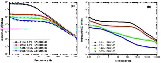 As shown in Figure 5a,b, after the first hour of immersion, the overall impedance of the BZI-SHX-80 at low frequencies was higher by approximately two orders of magnitude compared to the SHX-80-coated samples, with values of 5.7 × 107 ohms cm−2 and 9.1 × 105 ohms cm−2 for BZI-SHX-80 and SHX-80, respectively.