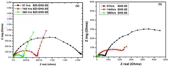 Figure 6 shows the Nyquist plots for both the BZI-SHX-80- (Figure 6a) and the OA-SHX-80- (Figure 6b) coated samples from 1–360 h, respectively. The plots show that the BZI-SHX-80 has the maximum impedance. These plots were used to obtain the equivalent circuit modelling fit using the ZSimpwin electrochemical impedance spectroscopy (EIS) data analysis software. Table 2 and Table 3 below demonstrate the fit data for the SHX-80 and the BZI-SHX-80 coatings after various immersion times. The equivalent circuits were used to simulate the corrosion reaction on the surface of the coated samples at 1 h, 48 h and 144 h, respectively. In these circuits, instead of using an ideal capacitor (C), a time-constant element (Q) was used to compare the current leakage in the capacitor and/or frequency dispersion effect of the alternating current signals []. The suggested equivalent circuits for each EIS plot after 144 h are provided in Figure 7 for both systems.