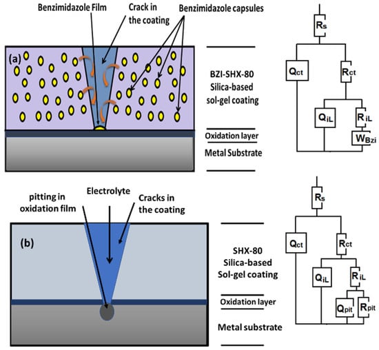 Schematic drawing of the hybrid silica-based system. (a) BZI-SHX-80 and (b) SHX-80 after 144 h of immersion in 3.5% NaCl solution.