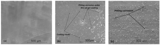 Electrochemical tests were performed on the bare and coated samples to assess their corrosion resistance. Tests were conducted by using a Princeton Applied Research PARSTAT 2273. The corrosion performance of the sol–gel-coated and uncoated aluminum alloy was evaluated using electrochemical impedance spectroscopy (EIS) and potentiodynamic polarization (PDPS) scans. An area of 1.00 mm2 in the center of the samples in aerated 3.5% NaCl was tested. The tests were carried out at room temperature (20 ± 2 °C). The electrode potential was monitored for approximately 1 h before polarization in the electrolyte solution until stability. The sample was polarized with PDPS at a scanning rate of 1.667 mVs−1 from the initial potential of −250 mV vs. OCP to +750 mV vs. SCE. The electrochemical impedance measurements were recorded between 100 kHz and 10 MHz with a sinusoidal AC RMS value of 10 mV [].