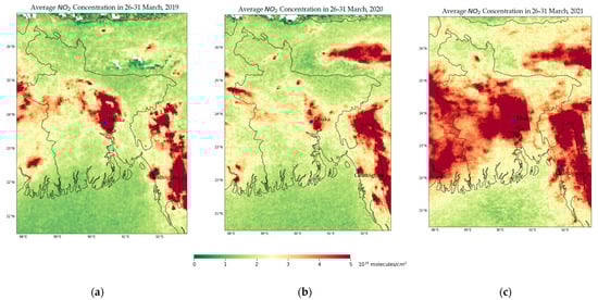 Average NO2 pollution over Bangladesh in March (a) 2019, (b) 2020, and (c) 2021. March 2021 was more polluted than the same time period in 2019 and 2020 throughout Bangladesh.