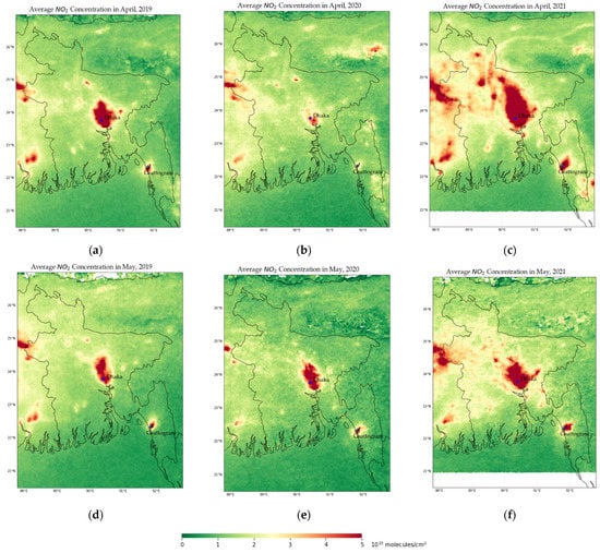 Average NO2 pollution over Bangladesh in April (a) 2019, (b) 2020, and (c) 2021 and May (d) 2019, (e) 2020, and (f) 2021. Bangladesh saw a drastic drop of NO2 pollution all over the country. Pollution decreased in April and May 2020 but increased in 2021.