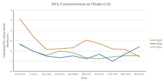 The COVID-19 pandemic has caused significant changes in society, the economy, and the lifestyles of people worldwide. To contain the spread of the SARS-2 virus, countries all around the world have been imposing different types of measures such as wearing masks, maintaining physical distancing, and vaccines. Initially, lockdowns were the most used strategy for most of the countries around the world to stop the transmission of the COVID-19 virus. The temporary or total closure of international borders, educational institutions, and non-essential businesses and restrictions on citizen mobility, have been some of the measures taken during lockdowns []. These lockdowns have led to some positive impacts on the environment, especially in improving air quality. A number of studies have proved that lockdowns have temporarily improved the air quality around the globe [,,,]. Several papers have also suggested a significant reduction of air pollution in Bangladesh [,]. Most of these papers investigated multiple air pollutants (CO2, O3, NO2, SO2, PM2.5, PM10, etc.). Nitrogen dioxides (NO2) are one of the important air constituents. The main sources of NO2 gases are industry, power plants, residential heating, and vehicle exhausts in the form of nitric oxide (NO) []. This reddish-brown gas is produced from NO conversion through the oxidation process. NO2 is a great indicator of human-made combustion activities and is a precursor of ozone (O3) and aerosols. Respiratory diseases and asthma can be caused by NO2. About 4 million cases of pediatric asthma annually result from exposure to NO2 []. Moreover, it can lead to environmental deterioration by producing acid rain [].