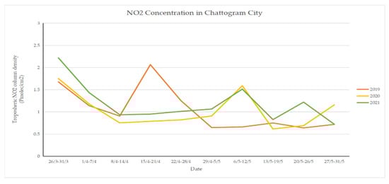 NO2 concentration in Chattogram city during the study period on weekly average.