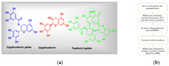 (a) Chemical structures of green tea polyphenols (representatives) and (b) the graphical summary of workflow followed.