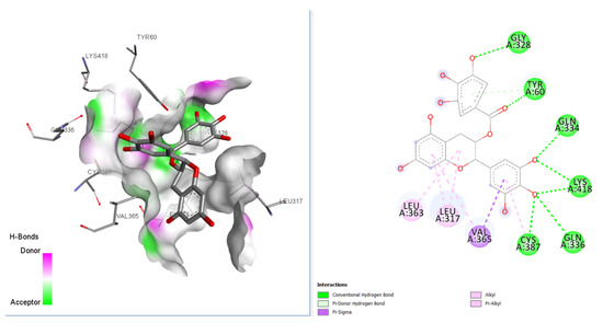 Our molecular docking analysis of 65 GTPs on 3 anti-TB targets suggested that epigallocatechin gallate (EGCG) had the highest affinity towards the DprE1 target, rather than 2X22 and 3IVX. The docking interactions depicted that this compound had interactions with GLN A:328, TYR A:60, GLY A:334, LYS A:418, VAL A:365, and LEU A:317 amino acids, with seven conventional hydrogen bonds present at the receptor site of the target 4P8C (Figure 2) [9,10]. VAL A:365 formed a pi–sigma interaction with the aromatic portion. Alkyl and pi–alkyl interactions were also observed for LEU A:363 and LEU A:317 amino acids. In Figure 2, it is also revealed that the binding mode of EGCG has favorable H-bond donors (purple colored) and acceptable (green colored) regions in the binding cavity. Table 1 and Table 2 give better insights into the interaction profiles of the studied green tea/black tea molecules. From our docking analysis of 65 bioactive compounds of tea on 4p8c, we found the top three best docked hits to be theaflavin-3-gallate (docking score: −124.06 kcal/mol), epigallocatechin gallate (docking score: −142.98 kcal/mol), and epigallocatechin (docking score: −127.73 kcal/mol). The docking affinities for these three bioactive compounds were found to be greater than the standard drug ciprofloxacin* (docking score: −109.20 kcal/mol). The standard drug isoniazid interacted with LYS A:367, VAL A:365, CYS A:387, and ASN A:385 amino acid residues (docking score: −121.21 kcal/mol). The binding cavity residues for the inbound ligands were found to be VAL A: 365, LYS A: 418, ASN A: 385, and LYS A: 418 (salt bridge). Moreover, our re-docking validation protocol also resulted in an RMSD value below 2 Å, suggesting that the docking results are valid.