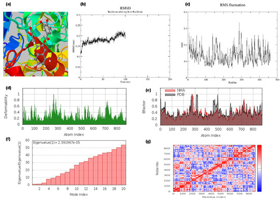 (a) The binding pocket; (b) the root mean square deviations (RMSD) of backbone atoms relative to the starting complexes during 100 ns MD; (c) protein RMSF plot (on this plot, peaks indicate areas of the protein that fluctuate the most during the simulation, and protein residues that interact with the ligand are marked with green-colored vertical bars); (d) deformability and (e) B-factor profiles; (f) eigenvalue and (g) covariance matrix of the complex for epigallocatechin gallate with 4p8c, respectively.