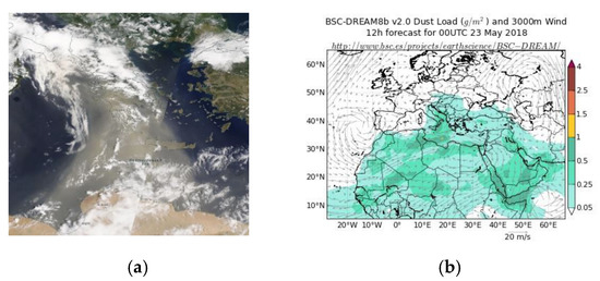 (a) Image of African dust transport in Greece on 23 May 2018 (MODIS visible imagery). (b) Dust load and 3000 m wind speed for 23 May 2018, (BSC-DREAM8b).