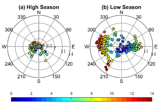 Wind-rose plot for (a) high port activity season (HS) and (b) low port activity season (LS).