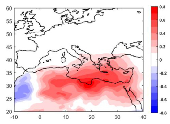 Composite difference of mean dust column mass density (gr/m2) between the low port activity and high port activity season. Red/blue colors indicate an increase/decrease of the mean dust column mass density (gr/m2).