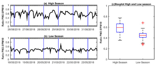 In general, human activities and meteorological conditions are important factors that affect the ratio between PM2.5 and PM10 [15]. The higher (lower) is more related to anthropogenic (natural) sources [15]. Additionally, the can be used to identify the source of the PMs, indicating whether the pollution is primarily due to anthropogenic or natural activity [2,20]. In order to investigate the impact of harbor operation on Igoumenitsa port, the is calculated. Figure 6 presents the variability of for the two studied seasons. During the HS, the ratio is about 0.13 higher compared to the LS (Figure 6c). Consequently, during the HS, the shipping has a more significant effect on the pollution levels of Igoumenitsa.