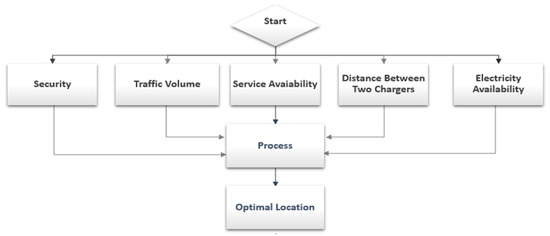 To maximize PEVs’ market share, a coordinated charging station (CS) network along highways and motorways is suggested. In this study, all vehicles were considered as cars, and heavy-duty traffic was not considered. Charging time was assumed to be 30 min for standardization, and the charger electricity consumption was 50 KW. The PEV charging port and CS charging port adopted the same type of standardization for the convenience of installation purposes. The tariff was assumed to be 35 rupees for dedicated load EV charging by the distribution companies and an annual 10% rupee devaluation. As the charging process interrupts the journey, only DCFC chargers were considered. To determine CS sites, we only considered rest-places with basic rest-place facilities as candidate sites. These facilities are available on the candidate site and also no farther than 250 m from it and are categorized as: (i) basic facility location: parking, small shops, and prayer provision (ii) medium facility location: supermarket, dining court, and minimum rest-place facility (iii) superior facility location: High-end rest and accommodation facility, food courts, and additional facilities such as a pharmacy, etc. By considering these facilities, the potential location of CSs could be selected based on the re-defined equation detailed in [7] for each nominated site, and the process is illustrated in Figure 1.
