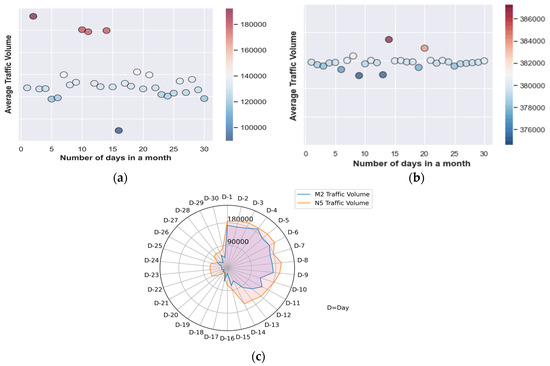 Vehicle flow data pre-COVID scenario on (a) M2; (b) N5; and (c) post-COVID scenario of M2 and N5.