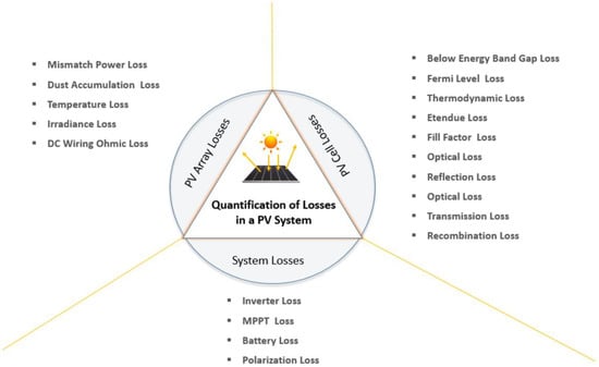 Depending on the nature of the losses experienced in a PV system reported in the literature, we broadly and briefly classified the major types of losses that are responsible for the reduced efficacy of whole PV systems at the PV cell level, array level, and system level and presented them in a pictorial form. Further, we discussed potential solutions to overcome fundamental and extended losses in PV systems. This illustration may become a brief and useful guide to create awareness of issues that may occur at the PV cell fabrication level and how they affect the whole PV system.