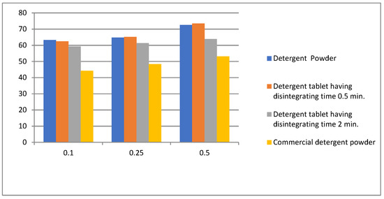 The cleansing properties of detergent and its tablet with marketed detergent were studied by a % detergency test. The effect of disintegrating agents was also studied at various concentrations (0.1%, 0.5% and 1%) and room temperature using distilled water. The cotton used for detergency was 100% RFD cotton white colour fabric. It was observed that the detergency of the tablet having a disintegrating time of 0.5 min. gave better stain removal than marketed powder and other detergent tablets (Table 3 and Figure 2).