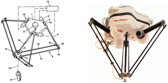 Schematic of the original Clavel’s Delta robot patented in 1990 [] and the first ABB Flexible Automation’s Delta robot IRB 340 FlexPicker launched in 1999. Source: ABB Robotics.