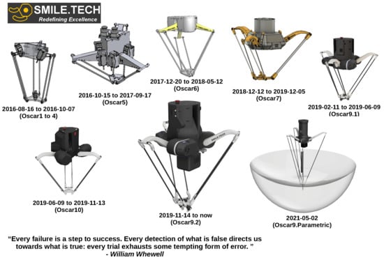 History of the iterative design, successive Delta robot model versions and Óscar family.