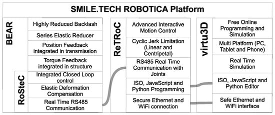 All robotic actuators (BEARs) are connected via an RS485 communication network and are managed by the ReTRoC. This controller is capable of interpreting commands sent by higher-order controllers or pre-programmed sequences stored on an SD card. Additionally, it manages motion and trajectory, converts coordinates, and calculates forces and their directions using data from the actuators’ torque sensors. Lastly, Virtu3D is an online tool that works on any computer, tablet, or smart-phone, that can be used to program and simulate robotic systems and that is capable of connecting to the robot controller via Ethernet or WiFi (Figure 5).