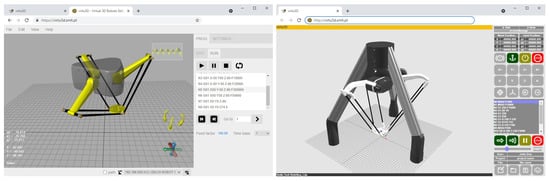 Virtu3D, a web-based application that can be used on any computer, tablet, or smartphone to program and simulate robotic systems and is capable of connecting to the robot controller via Ethernet or WiFi. On-line kinematics simulator available at https://virtu3d.smlt.pt; current (left, accessed on 11 March 2022) and future (right) versions.
