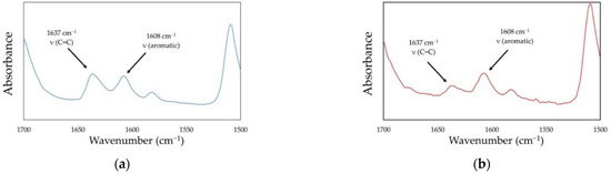 where AC=C is the absorption intensity of the band resulting from the carbon–carbon double bond stretching vibrations, located at 1637 cm−1, and AAr is the absorption intensity of the internal standard—the band resulting from the skeletal stretching vibrations of the carbon–carbon bonds in the aromatic rings, located at 1608 cm−1.