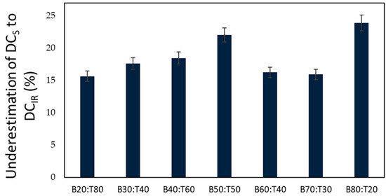 The degree of conversion was also examined by using the FTIR technique (DCIR). Representative FTIR spectra of the B80:T20 uncured and cured samples are shown in Figure 1. The FT IR spectra of the remaining compositions in their cured and uncured forms can be found in the Supplementary Materials (Figures S1–S6). The results obtained for the DCIR are summarized in Table 2. DCIR values ranged from 55.30 to 61.34%. As can be seen from Table 2, the DCIR values were higher than the corresponding DCS values. Nevertheless, it is worth noting that a similar tendency was observed in both methods. The DCIR values increased as the Bis-GMA content increased up to 70% and then decreased when the Bis-GMA content exceeded 70%. The difference between the DCS and DCIR values ranged from 15.66 to 23.90% (Figure 2).