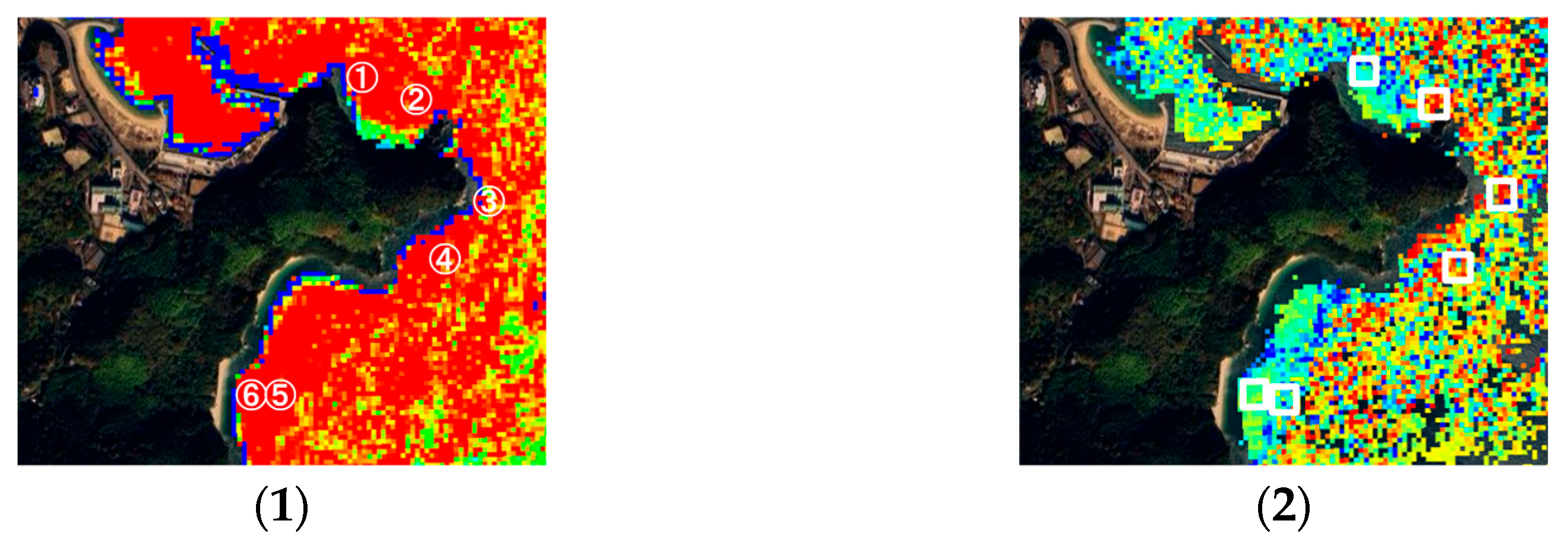 Figure 1 (2), the closer the mapping color is to red, the more likely it is that algal beds are present. For points 1-6 shown in