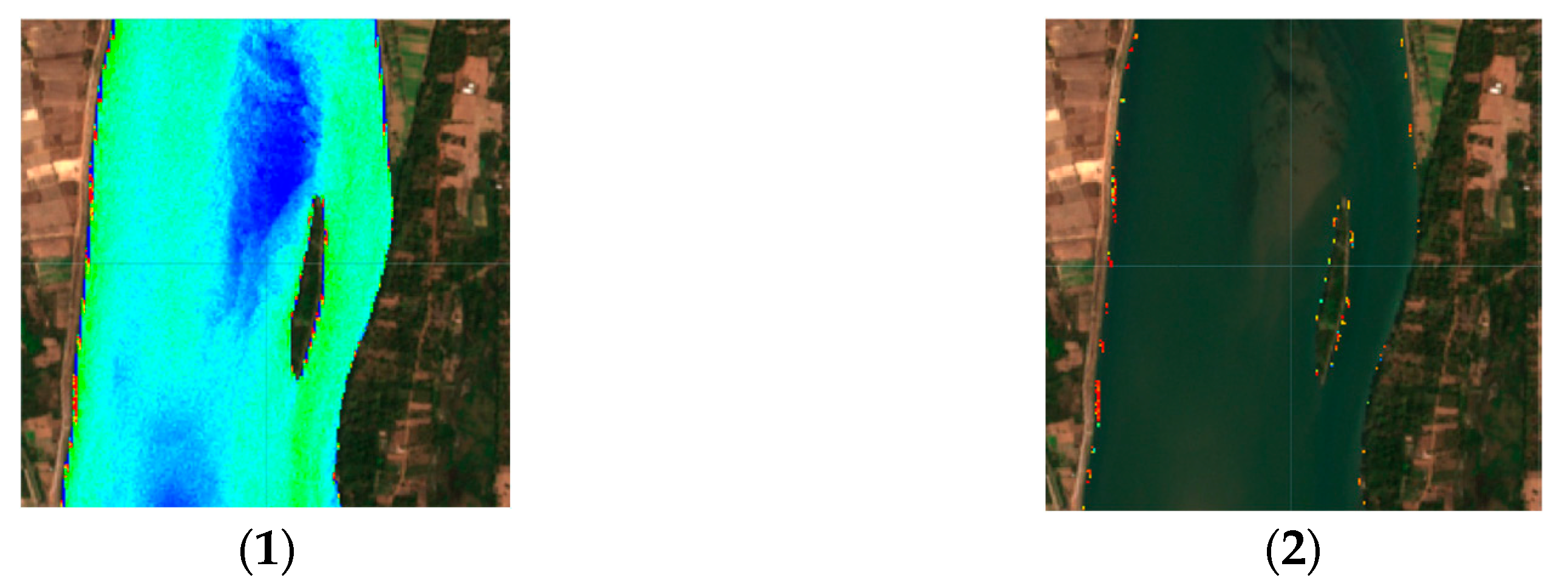In the Mekong context, recent work by Nontapon et al. employed Landsat-8 imagery validated by in situ data (2017–2023) to estimate suspended sediment concentration (SSC) using indices such as NDSSI, NSMI, and NDTI, achieving an R