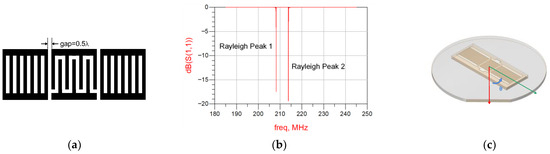 To obtain the temperature–frequency characteristics of as many modes as possible, we designed a saw resonator with two distinct Rayleigh mode resonant peaks using the COMs model. This was achieved by adjusting the gap between the reflectors and the IDTs, as shown in Figure 1a, changing it from the conventional 0.375λ to 0.5λ, where λ is the wavelength, so that both resonant peaks of the Rayleigh mode could be excited. The simulation results are shown in Figure 1b. Furthermore, since the first two Euler angles of the LGS substrate were fixed, we changed the third Euler angle by rotating the saw pattern on the substrate, as shown in Figure 1c. Since LGS belongs to the trigonal crystals and its third Euler angle is symmetrical about 90°, we chose a total of eleven angles (0, 138.5°, θ°, where θ = 14, 20, 27, 35, 44, 55, 63, 70, 80, and 90) to design the device. It is worth noting that not all the 11 cuts were made in Rayleigh mode, and not all cuts can excite two Rayleigh mode resonant peaks. The special cuts are (0, 138.5°, 0°), (0, 138.5°, 27°), (0, 138.5°, 80°) and (0, 138.5°, 90°). The first three cuts have only one single Rayleigh peak, while the last cut has only one single pure shear mode peak.