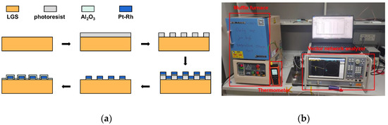 The fabrication process of the experimental LGS SAW resonator with Pt-Rh alloy electrodes is described in Figure 2a. The 4-inch (0, 138.5°, θ°) cut LGS wafer was first prepared according to the standard cleaning instructions. After cleaning, the wafer was coated with a negative photoresist, followed by ultraviolet exposure to transfer the pattern from the mask to the wafer after development. Then, a 10 nm adhesive layer Al2O3 and a 400 nm Pt-Rh electrode were successively deposited using magnetron sputtering. The film layer was patterned using the lift-off process. Finally, to prevent the agglomeration of Pt-Rh electrodes at high temperature, the entire wafer was deposited with 40 nm Al2O3 using magnetron sputtering as the passivation layer.
