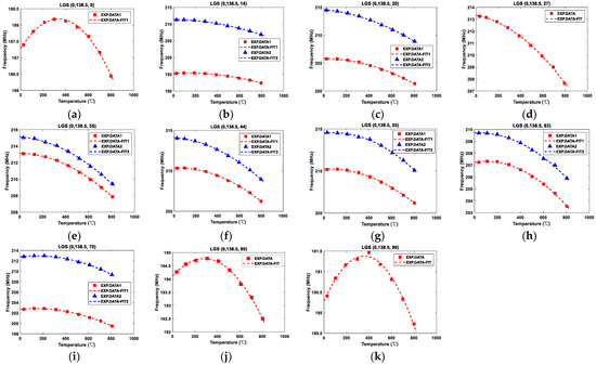 (a–k) The fractional frequency change of 11 devices from room temperature to 800 °C. The red squares represent the measured resonant peaks at lower frequencies, and the red dotted lines represent the fitting curves of the resonant peaks at lower frequencies, the blue triangles represent the measured resonant peaks at higher frequencies, and the blue dotted lines represent the fitting curves of the resonant peaks at higher frequencies.