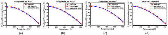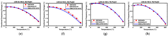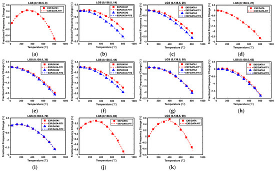 The relationship between frequency or fractional frequency change and temperature can be fitted into a quadratic function, and the measured original data and fitting curves of all eleven different cut devices from room temperature to 800 °C are shown in Figure 3 and Figure 4.