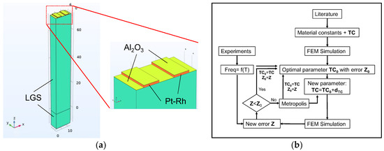 (a) Finite element models for intrinsic frequency simulation at different temperatures; (b) The simulated annealing process for fitting the temperature coefficient of materials of devices.