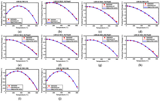 To examine the accuracy of the temperature coefficients of these materials and the accuracy of the finite element simulation method, the remaining seven cuts were simulated using the obtained LGS material temperature coefficients, and the simulation results were compared with the test sets, as shown in Figure 7a–j. Although the cuts in the test sets were not included in advance, the established model can still simulate them quite well.