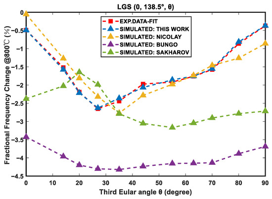 Finally, the common LGS material parameters in the literature [3,4,6] were introduced into the finite element simulation model. The obtained simulation results were compared with the simulation results obtained from our training and the measured results. The results are shown in Figure 8. Due to the overly large number of results, only the fractional frequency changes in the low-frequency resonant peak in each cut at 800 °C were selected for comparison. It can be seen that the simulation results obtained in this paper have the best agreement with the measured results. The LGS material parameters and temperature coefficients obtained in the model described in this paper are shown in Table 1. The basic material parameters of LGS are obtained from the literature [6]. It should be pointed out that during the fitting process, if the density of the material is also fitted as a temperature-related variable, the final simulation results obtained will never correspond well to the measured results. This might be related to the establishment of our model. We will continue to pay attention to this point in subsequent research.