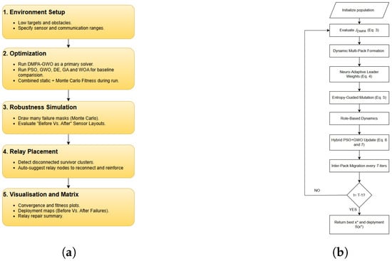 DMPA–GWO++ workflow showing (a) the overall pipeline—environment setup, composite and Monte Carlo evaluation, failure simulation, relay placement, and final metric computation—and (b) the core algorithmic blocks, including adaptive multi-pack formation, neuro-adaptive leadership, entropy-guided mutation, role-based dynamics, and hybrid PSO–GWO updates that iteratively optimize candidate solutions and return the best solution x*, yielding the final sensor deployment S(x*).