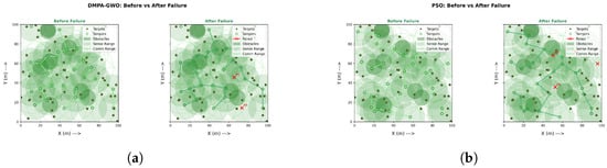 Overall performance (1/3): DMPA–GWO++ vs. PSO. (a) High coverage; survivor graph largely stays connected after failures. (b) Good coverage; survivor graph fragments in multiple regions.