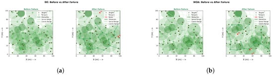 Overall performance (3/3): DE vs. WOA. (a) Moderate coverage; fragmentation persists after failure. (b) Highest raw coverage; backbone breaks after failure.