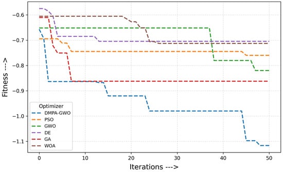 Robust variants of PSO, GWO, DE, GA, and WOA were implemented as baselines. Each used the robust-only objective under the same computational budget, with population size 30, 50 iterations, and identical box constraints.