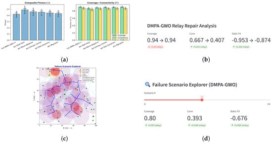 With , connectivity was typically restored with 2–3 relays (median = 2, IQR = 2–3), while coverage remained largely unaffected. Figure 6b. reports the ablation results: the multi-pack mechanism produces the largest benefit (≈25% loss reduction), with neuro-adaptive and entropy modules improving stability and diversity; role-based dynamics aid reconnection and migration reduces variance, together yielding balanced coverage–connectivity. Greedy bridging required only a few relays, as optimized layouts already aligned sensors along resilient corridors. Minor static penalties from relay overlap were offset by connectivity gains (Figure 6c), with overall coverage and fitness improving after relay insertion (Figure 6d).