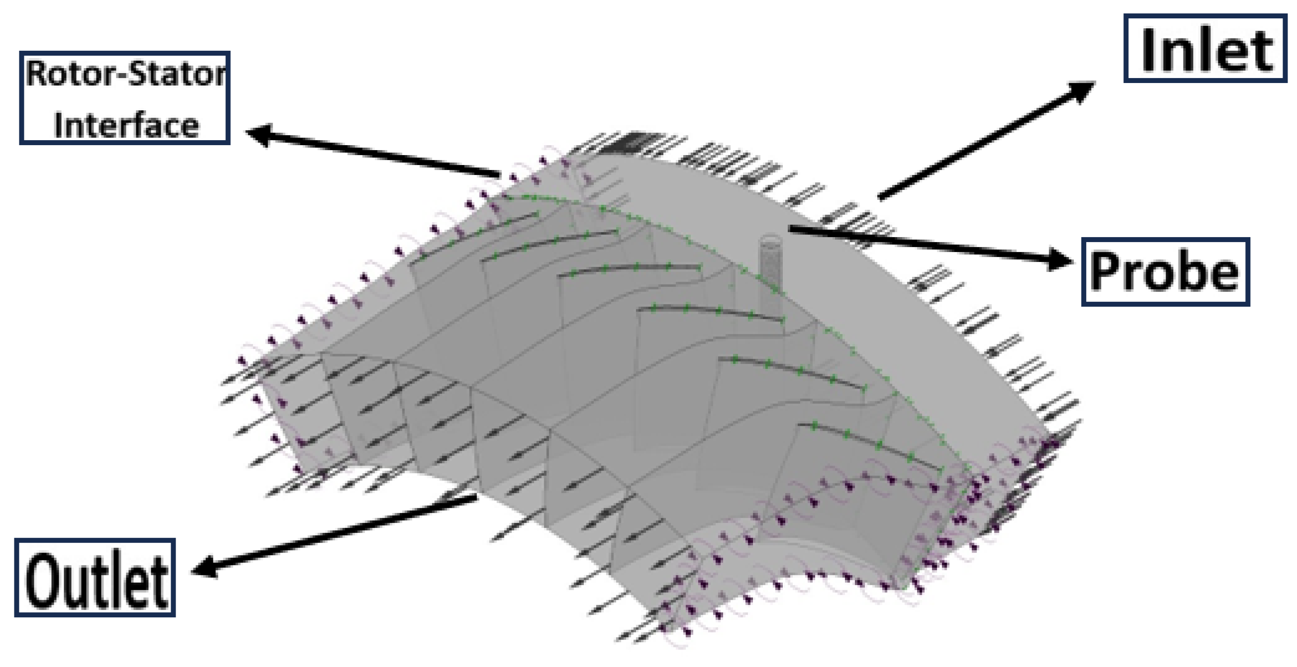 - Islam, A.; Ma, H. Numerical study of probe parameters on performance of a transonic axial compressor. PLoS ONE 2021, 16, e0245711. [Google Scholar] [CrossRef]