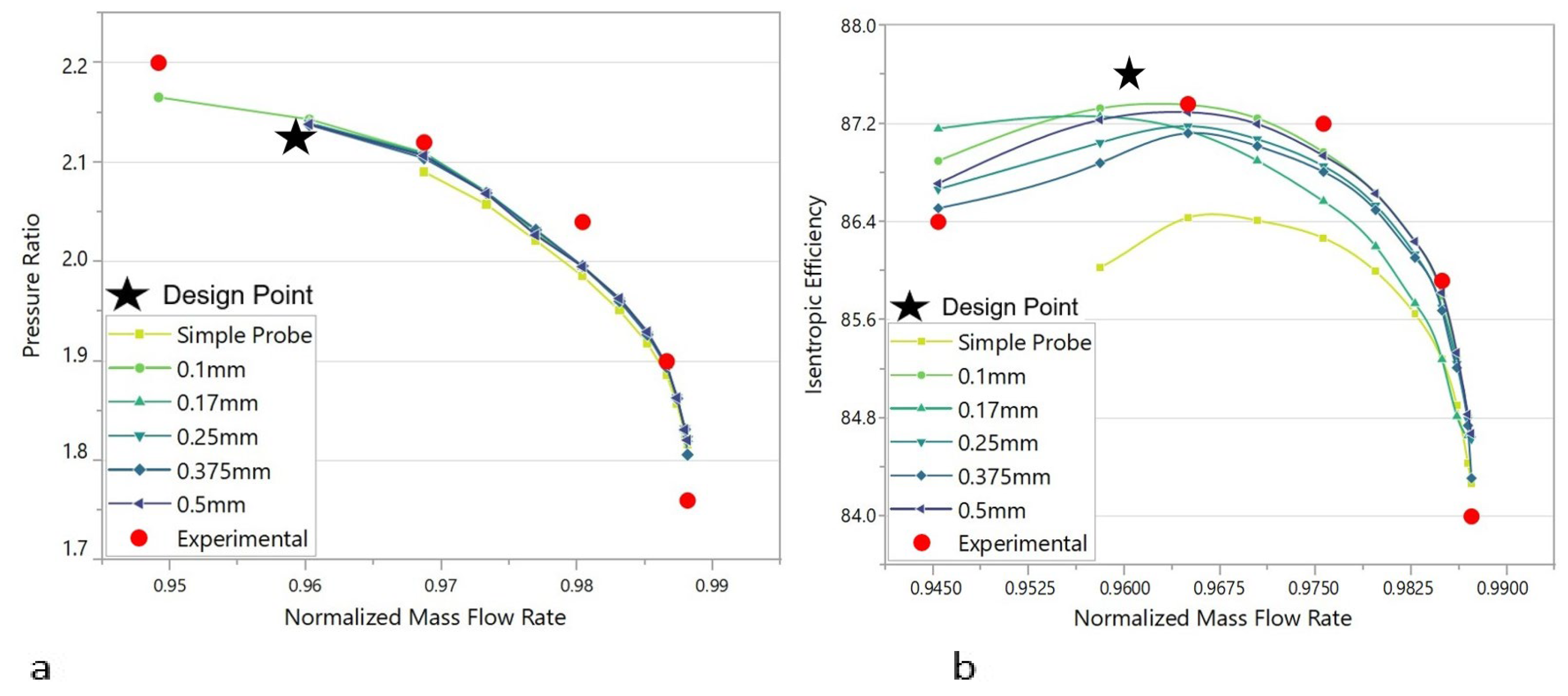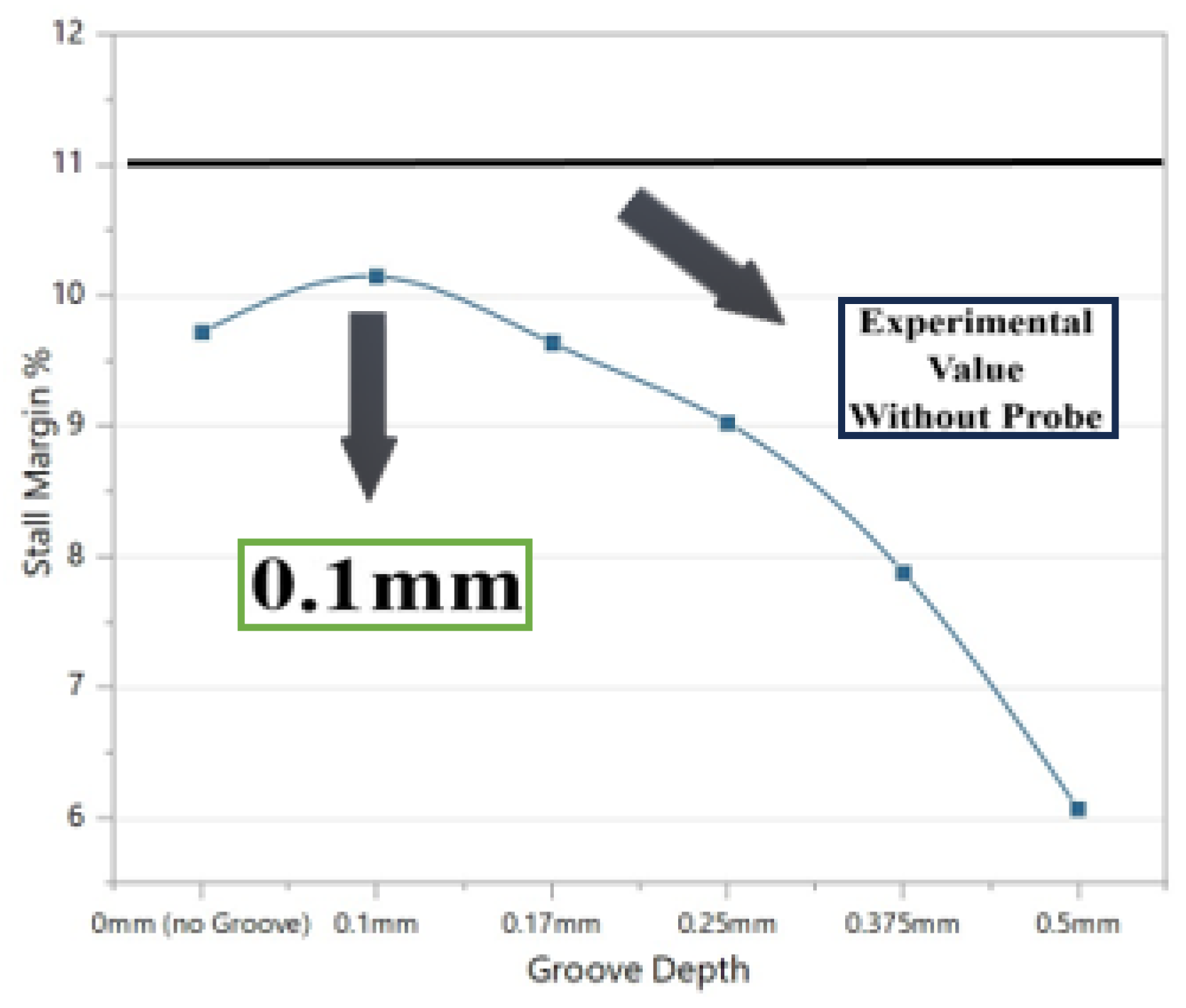 - In the spanwise direction, the 0.1 mm probe delayed the stall near blade tips (55–95%), whereas the 0.5 mm groove increased the risk of shock and reverse flow.