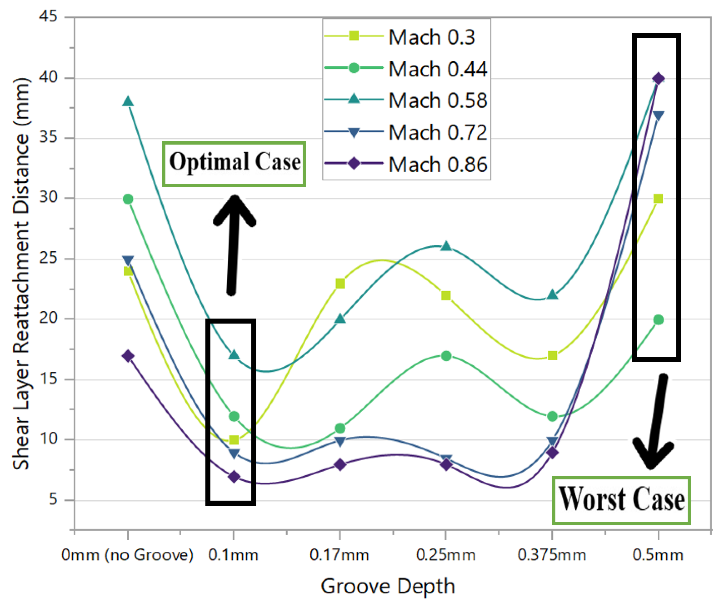 - The 0.5 mm groove introduced excessive turbulence, resulting in flow instability, poor pressure recovery, and impaired reattachment in both spanwise and streamwise directions.