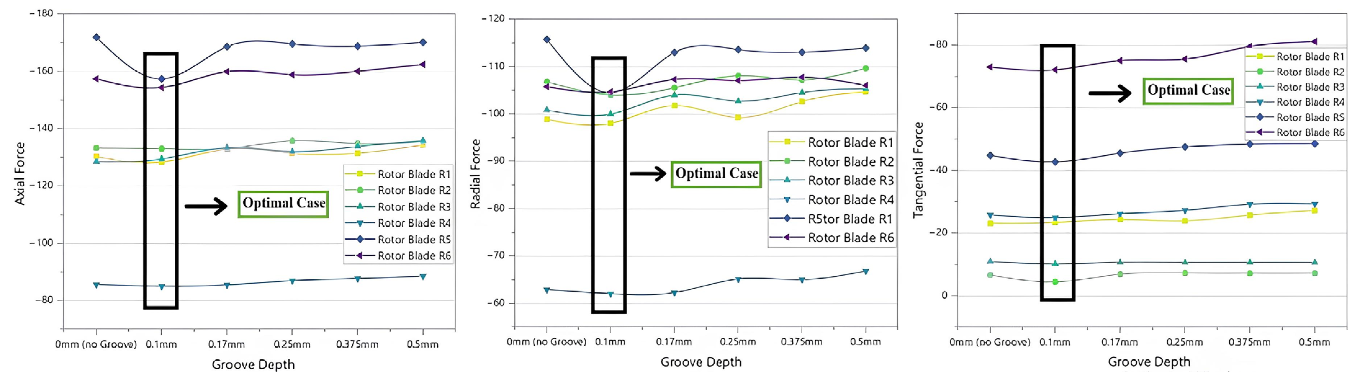 - Overall, deeper grooves (0.375 mm and 0.5 mm) degraded performance, while the 0.1 mm groove proved to be the most efficient design for minimizing losses and enhancing compressor stability.
